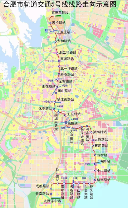 合肥市軌道交通5號(hào)線項(xiàng)目概況:線路為南北走向,南起濱湖新區(qū)的貴陽(yáng)路站,北至廬陽(yáng)區(qū)汲橋路站,全長(zhǎng)40.2公里,全線為地下線,共設(shè)車(chē)站33座(其中云谷路站、高鐵站、蒙城路站已與1號(hào)線、3號(hào)線同步實(shí)施),線路在官塘設(shè)車(chē)輛段1座、在濱湖設(shè)停車(chē)場(chǎng)1座,車(chē)輛采用B型車(chē)、6輛編組。